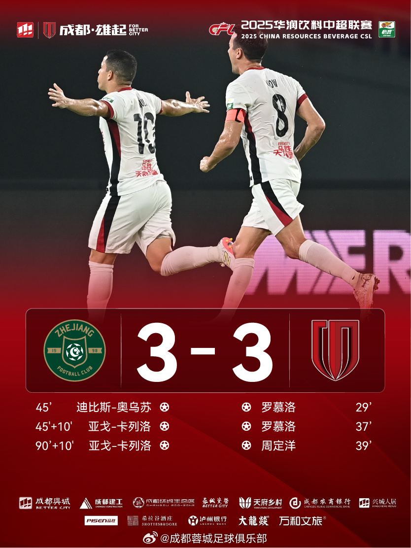 领先三球后被连追三球,成都蓉城错失了一场胜利,将榜首位置拱手让出。9月26日晚,成都蓉城在中超联赛第26轮客场挑战浙江队。罗慕洛率先梅开二度,周定洋锦上添花,没想到浙江队之后连追三球,并且是比赛结束前读秒绝平,将比分扳成3-3。而蓉城的最大竞争对手上海海港3-2绝杀武汉三镇,积分反超蓉城重回积分榜首。